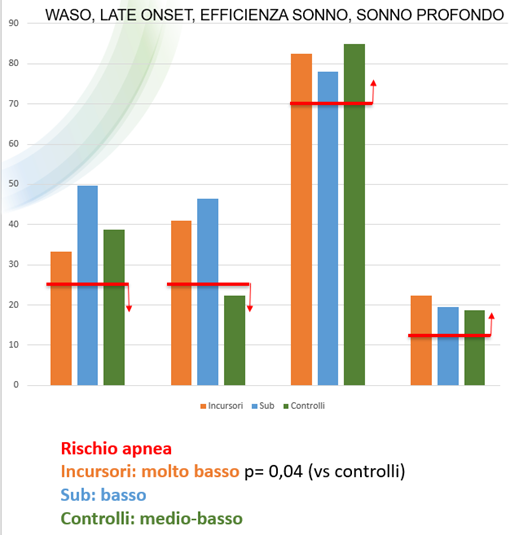 L’analisi dell’andamento del sonno (figura 2) ha evidenziato lievi alterazioni in tutte le categorie analizzate: ad esempio il WASO (risvegli dopo l’addormentamento, VN < 30 min) era di circa 50,6±11,1 min nei palombari ed ai limiti superiori della norma per le altre due categorie, mentre il tempo di addormentamento (Late Onset, VN < 30 min) era aumentato sia negli incursori (41 min) che nei palombari (37 min), normale nei controlli (22 min). Anche l’efficienza del sonno (VN >85%) era ridotta in tutti e tre i gruppi (80% negli incursori, 82% nei palombari, 84% nei controlli), mentre il tempo di sonno profondo (VN>15%) era conservato in tutte le categorie analizzate. Nonostante ciò, non si evidenziava un rischio aumentato di apnee notturne.